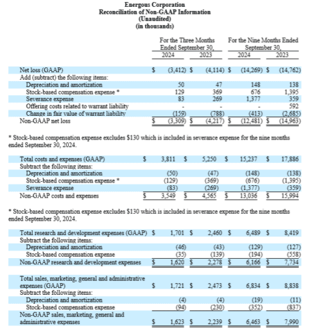 • Costs and expenses for the three months ended September 30, 2024 totaled $3.8 million versus $5.3 million in the same 2023 period. Total third quarter 2024 GAAP costs and expenses consisted of approximately $0.3 million in cost of revenue, $1.7 million in research and development (R&D) expenses, $1.7 million in sales, marketing, general and administrative (SG&A) expenses, and approximately $0.1 million in severance expenses.